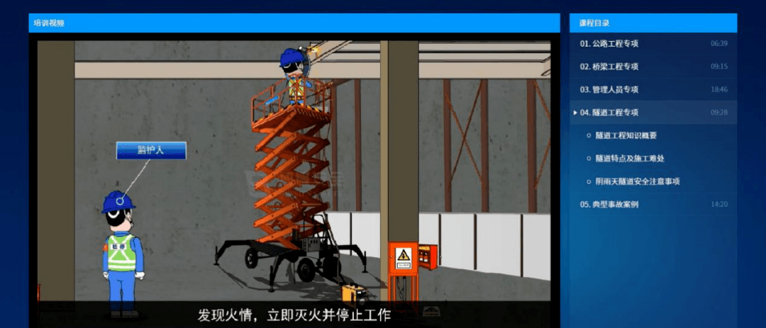 以安全教育培训为例:管理人员无需费时费力准备复杂的资料,通过工具箱系统选择课程或自主创建培训方案,启动集中培训后,系统将按照培训专题自动播放多媒体安全培训课件,课程全部采用多媒体形式,学员集中接受安全培训。培训课程风格多样,有2D/3D卡通风格、MG动画风格和宣教写实风格等。课件趣味性强,以较夸张的卡通风格人物、场景演绎事故风险,通俗易懂的语言突出重点知识点,直观生动不乏味,令员工记忆深刻。