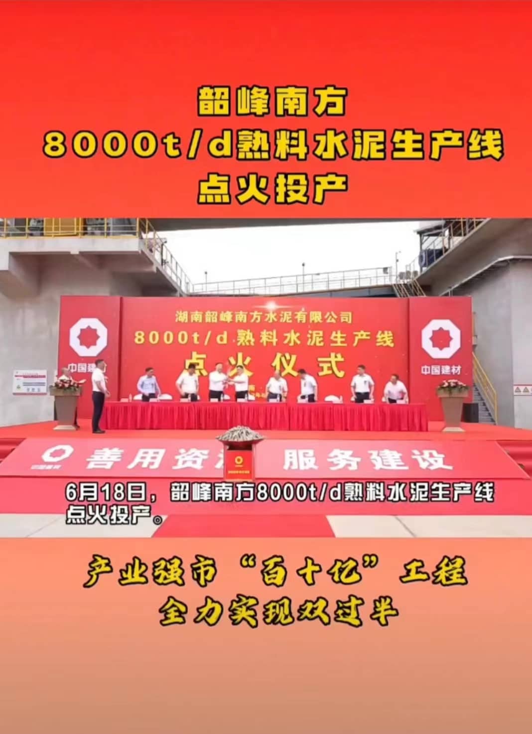 6月18日,韶峰南方8000t/d熟料水泥生产线点火投产。中南水泥党委书记、董事长、总裁吕文斌,湘潭市人大常委会副主任、湘乡市委书记赵新文,市委副书记、市长郭勇出席点火仪式。