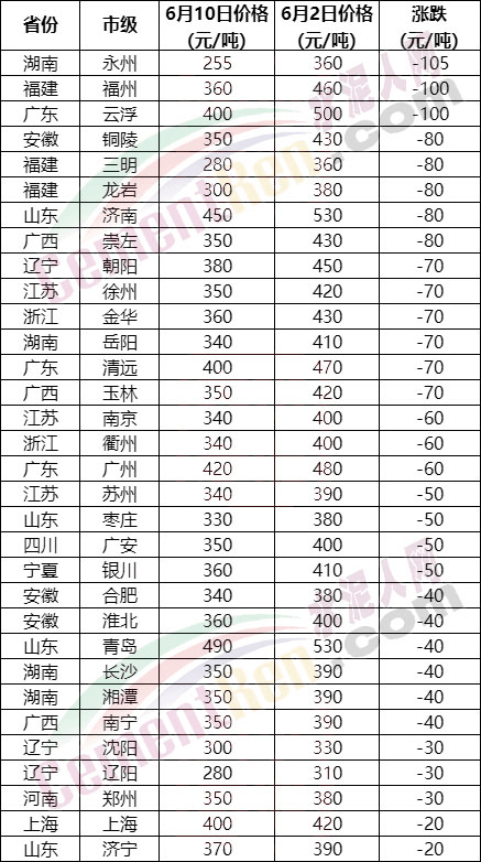 据水泥人网信息中心数据,6月中上旬,三十多个地区水泥价格持续下滑,其中湖南永州水泥价格直降105元/吨,其次是福建福州和广东云浮周降价100元/吨。