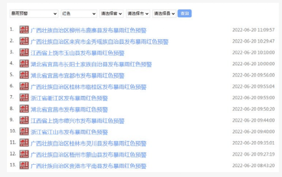 据水泥人网了解,20日浙江、广西、江西、湖北等多地发布暴雨红色预警。图片