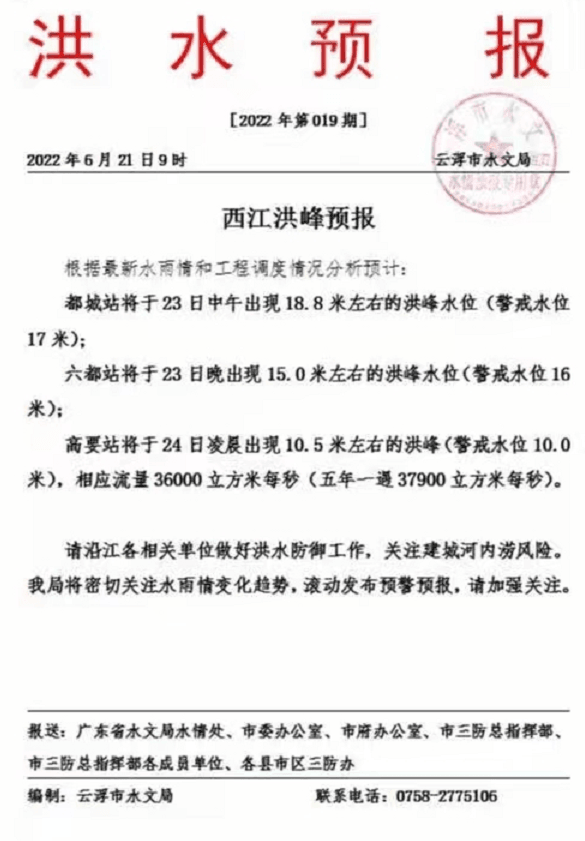 云浮市水文局发《洪水预报》称, 根据最新水雨情和工程调度情况分析预计:都城站将于23日中午出现188米左右的洪峰水位(警戒水位17米);六都站将于23日晚出现150米左右的洪峰水位(警戒水位16米);高要站将于24日凌晨出现105米左右的洪峰(警戒水位10.0米),相应流量36000立方米每秒(五年一遇37900立方米每秒)。请沿江各相关单位做好洪水防御工作,关注建城河内涝风险。