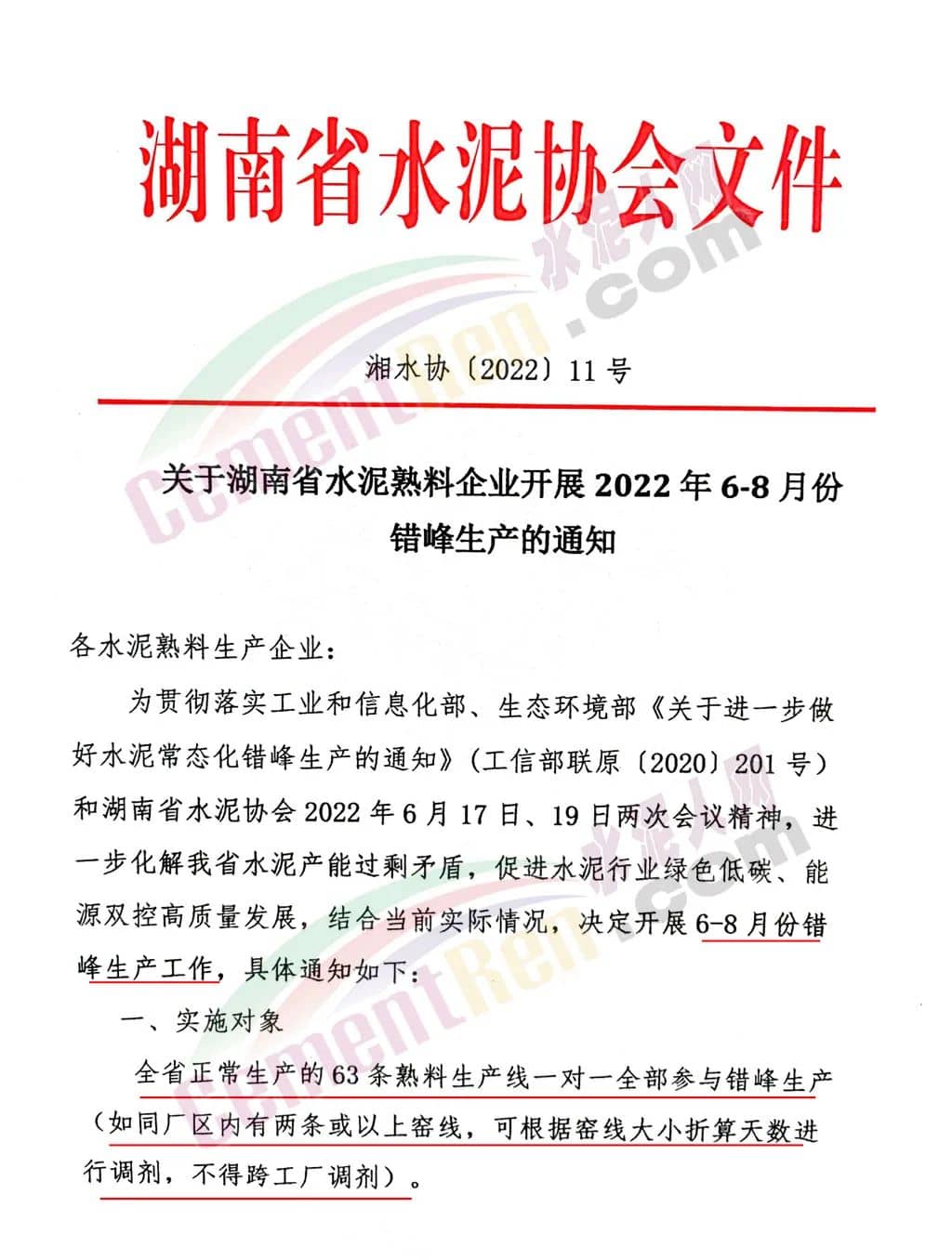 日前,湖南、江西两省分别通知辖区内所有水泥熟料企业执行夏季错峰生产。湖南省通知称,为进一步化解水泥产能过剩矛盾,促进水泥行业绿色低碳,能源双控高质量发展,结合当前实际情况,决定开展6-8月份错峰生产工作。全省正常生产的63条熟料生产线一对一全部参与错峰生产,如同厂区内有两条或以上窑线,可根据窑线大小折算天数进行调剂,不得跨工厂调剂。