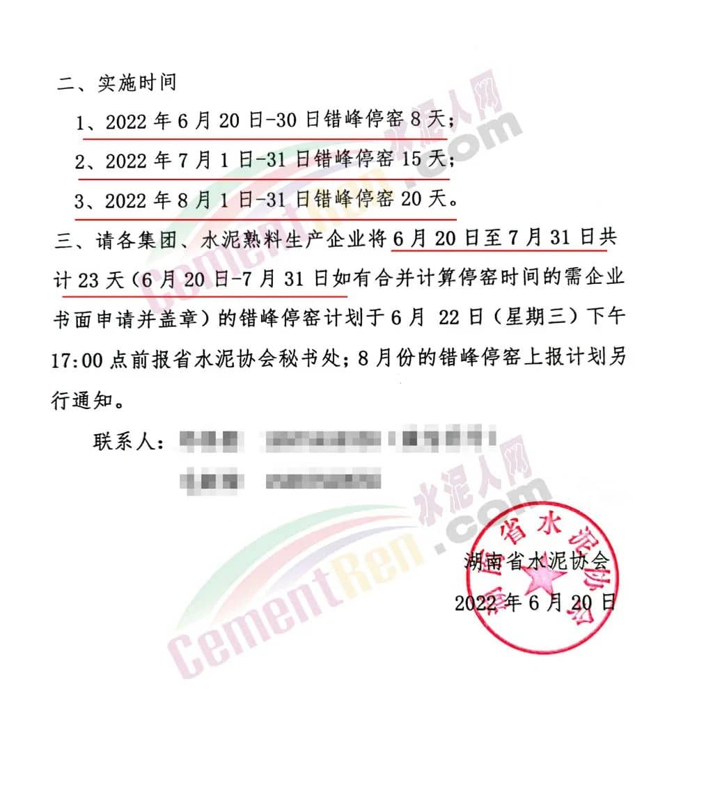实施时间,6月20日~30日错峰停窑8天;7月1日~31日错峰停窑15天;8月1日至31错峰停窑20天,共停窑43天。其中6月20日到7月31日,共停23天。