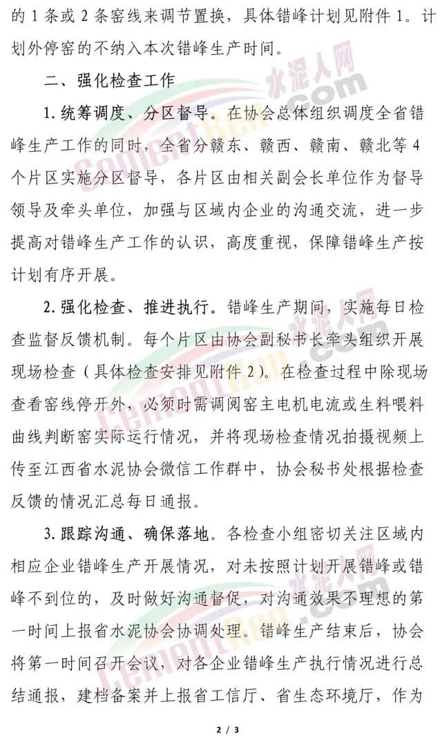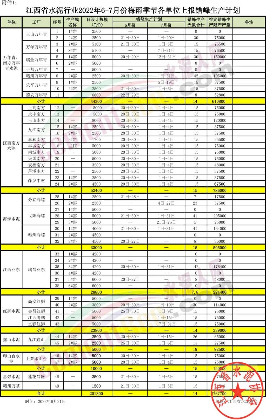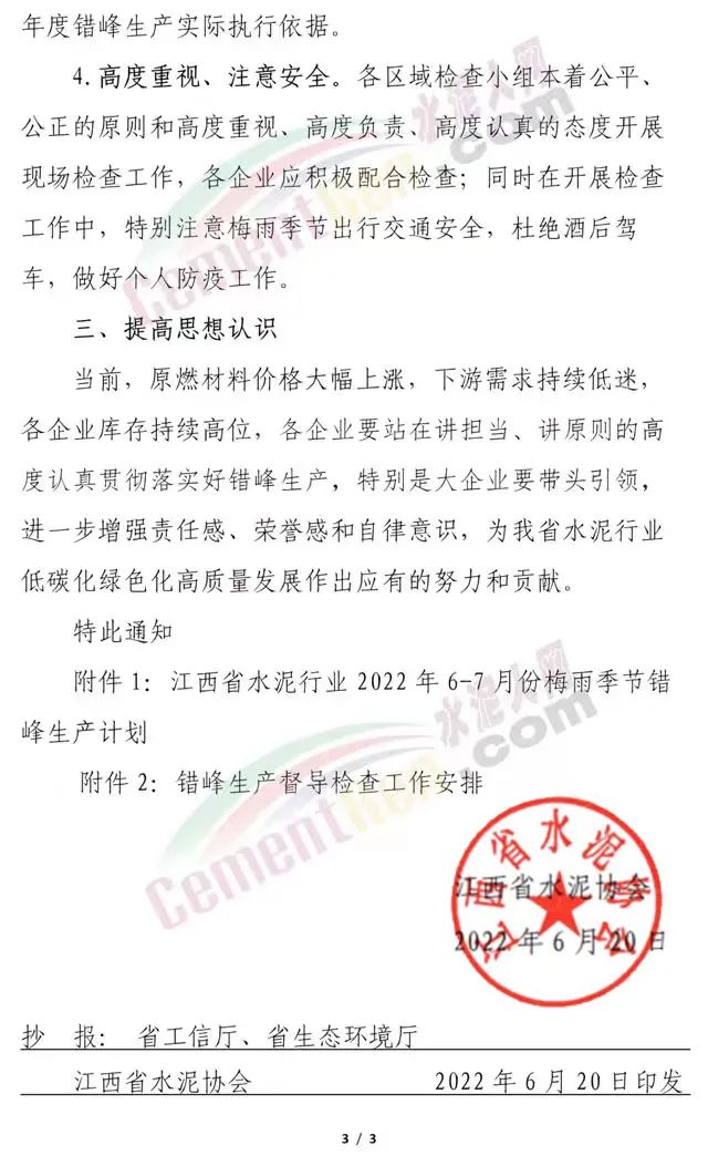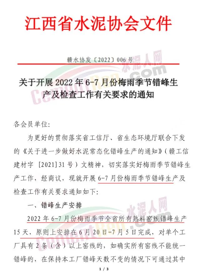 江西省通知要求全省所有熟料窑线错峰生产15天,原则上安排在6月20日-7月5日完成,对单个工厂具有2条(含)以上窑线的,如确实所有窑线不能统一错的,在保持本工厂错峰天数不变的情况下可通过其中的1条或2条窑线来调节置换,计划外停窑的不纳入本次错峰生产时间。