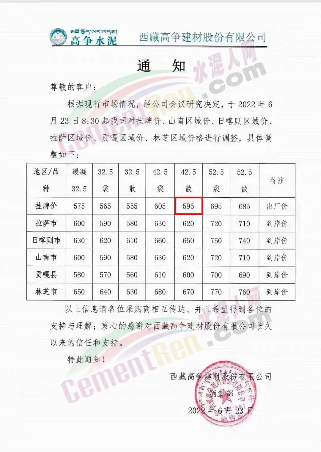 水泥人网通讯员消息,6月23日西藏高争建材股份有限公司通知,根据现行市场情况,经公司研究决定于6月23日8时30分起对公司挂牌价、山南区域价、日喀则区域价、拉萨区域价、贡嘎区域价、林芝区域价进行调整。调整后P.O42.5散装水泥挂牌出厂价595元/吨,林芝市到岸价670元/吨。