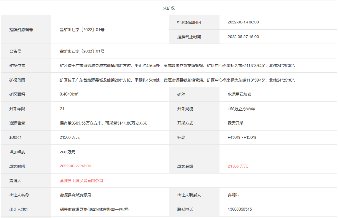 日前,广东省韶关市自然资源交易系统发布,翁源县中源发展有限公司以超2亿元成功竞得广东省翁源县铁龙镇将军屯北部矿区水泥用灰岩矿采矿权,该矿区出让范围内,建筑石料用资源储量超5000万吨,年生产规模160万立方米,出让年限21年。
