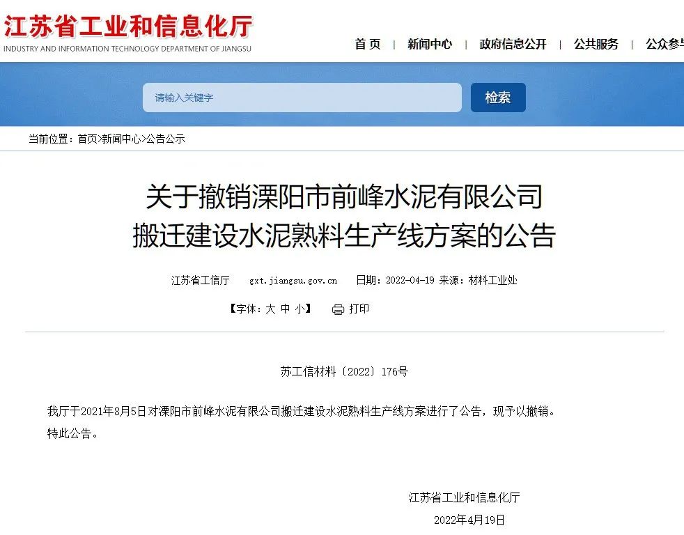 今年4月19日,江苏省工信厅发布公告称,撤销2021年8月5日发布的《溧阳市前峰水泥有限公司搬迁建设水泥熟料生产线方案公告》。