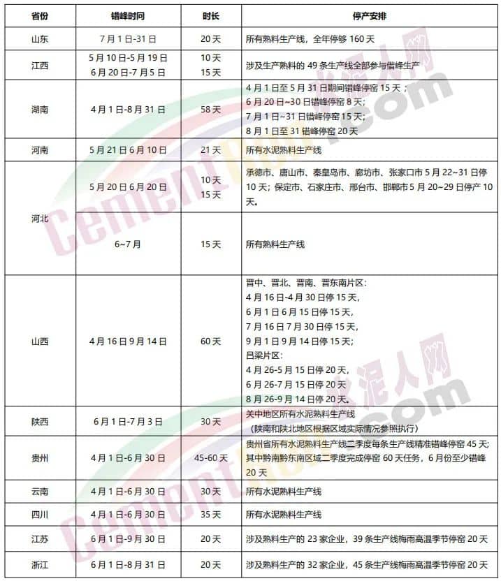 此前,贵州、陕西等地已发布二季度水泥停窑计划安排,不少地区停窑时间超过1个月。