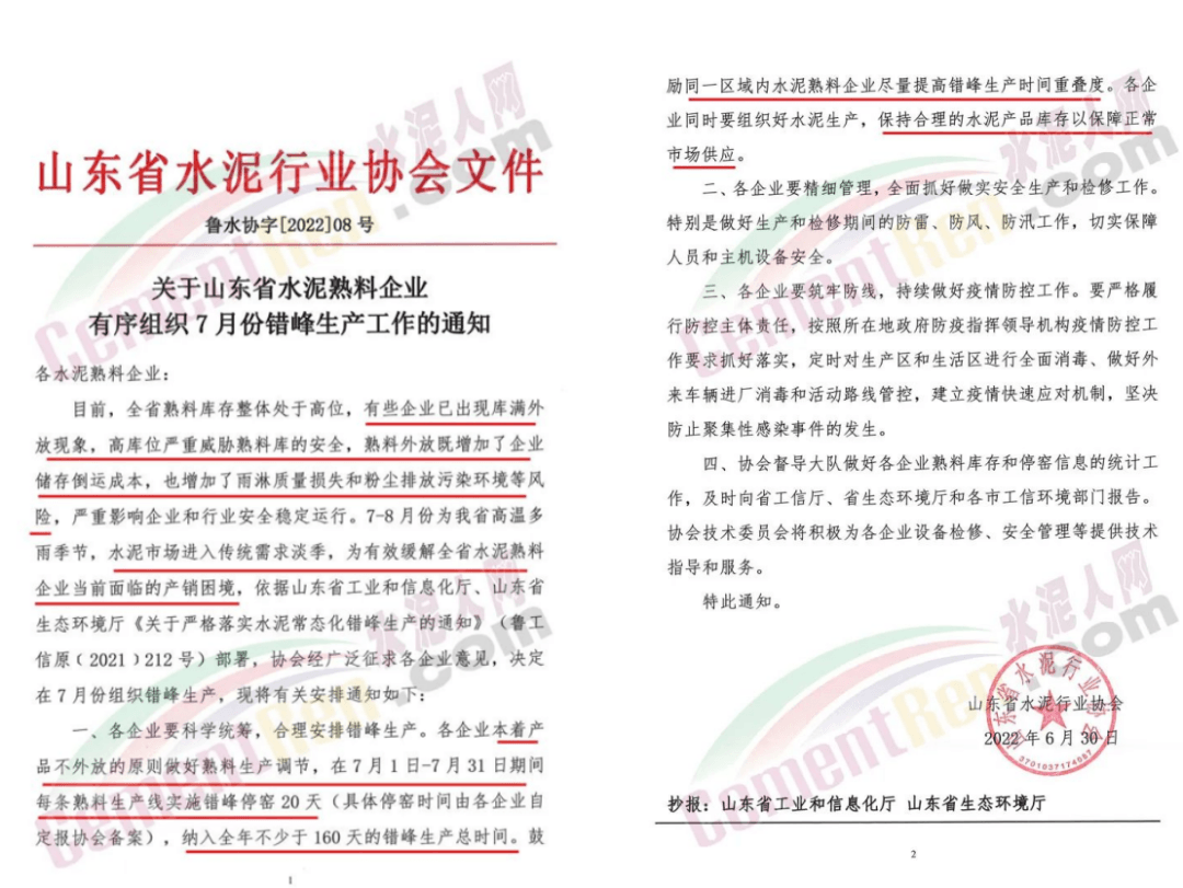 山东省水泥行业协会发布《关于山东省水泥熟料企业有序组织7月份错峰生产工作的通知》提到,全省熟料库存整体处于高位,有些企业已出现库满外放现象,高库位严重威胁熟料库的安全,熟料外放既增加了企业储存倒运成本,也增加了雨淋质量损失和粉尘排放污染环境等风险。通知要求各企业本着产品不外放的原则做好熟料生产调节,在7月1日-31日期间每条熟料生产线实施错峰停窑20天,纳入全年不少于160天的错峰生产总时间。