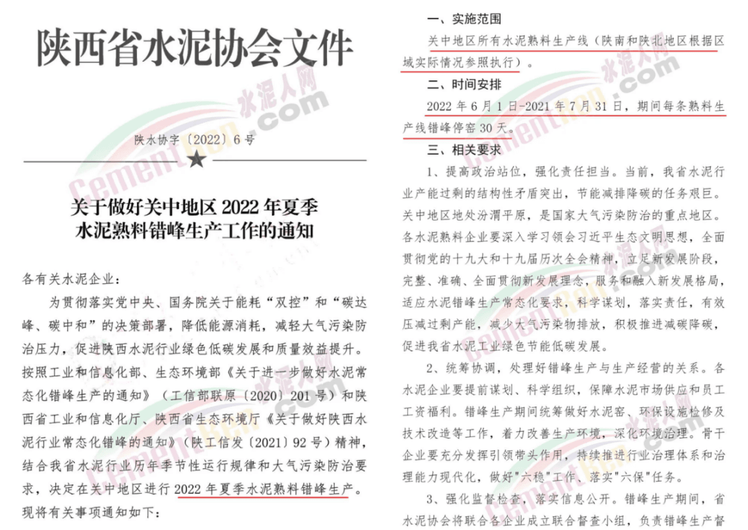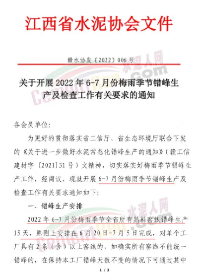 江西省水泥协会也在近日发布关于开展2022年6-7月梅雨季节错峰生产及检查工作有关要求的通知,全省所有熟料窑线错峰生产15天,对单一工厂具有2条(含)以上窑线的,如确实所有窑线不能统一错峰,在保持本工厂错峰天数不变的情况下可通过其中的1条或2条窑线进行调节置换。计划外停窑的不纳入本次错峰生产时间。