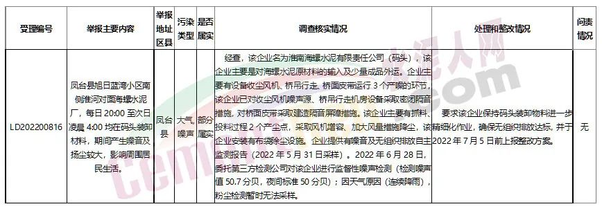 日前,淮南市人民政府发布《淮南市关于省第二生态环境保护督察组第二十四批交办件查处情况的公示》称,安徽省第二生态环境保护督察组6月26日(第二十四批)交办我市的9件信访件,截至7月2日,已办结4件。其中,经查属实的3件,部分属实4件,不属实2件,责令整改1件,立案1件,约谈1人。其中涉及一起针对于海螺水泥厂的举报案。