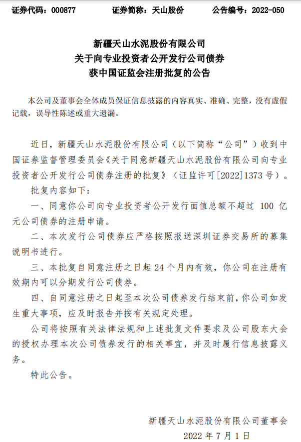 近日,新疆天山水泥股份有限公司(以下简称“公司”)收到中国证券监督管理委员会《关于同意新疆天山水泥股份有限公司向专业投资者公开发行公司债券注册的批复》(证监许可[2022]1373号)。批复内容为同意天山水泥向专业投资者公开发行面值总额不超过100亿元公司债券的注册申请。