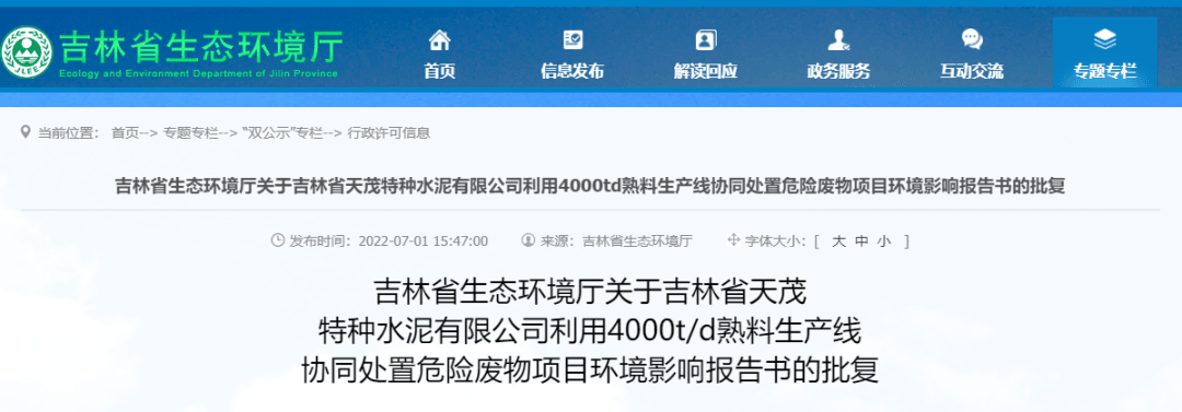 你公司《关于〈吉林省天茂特种水泥有限公司利用4000t/d熟料生产线协同处置危险废物项目环境影响报告书〉审查的申请》及委托吉林省中实环保工程开发有限公司编制的环境影响报告书(报批版)收悉。经研究,现批复如下: