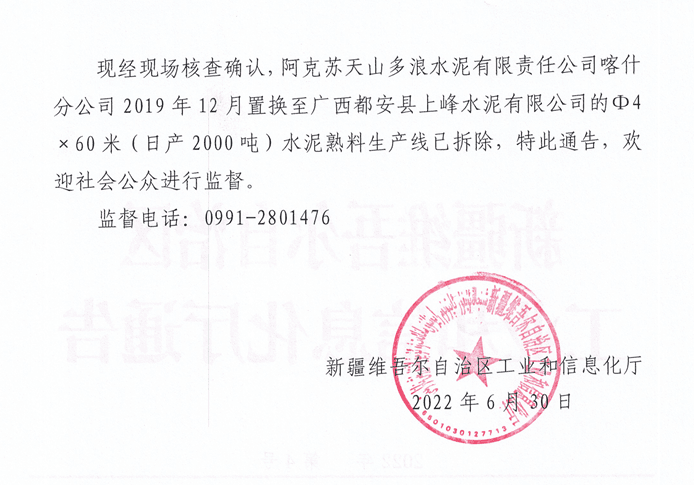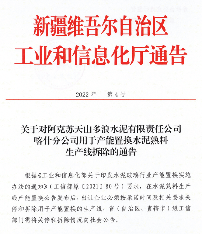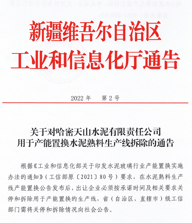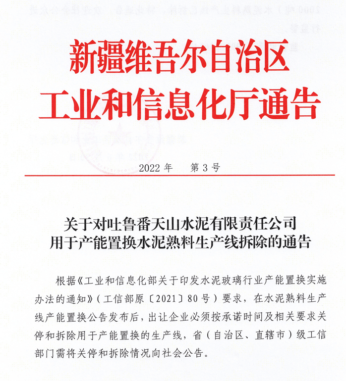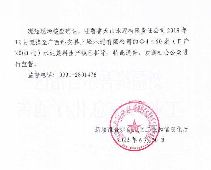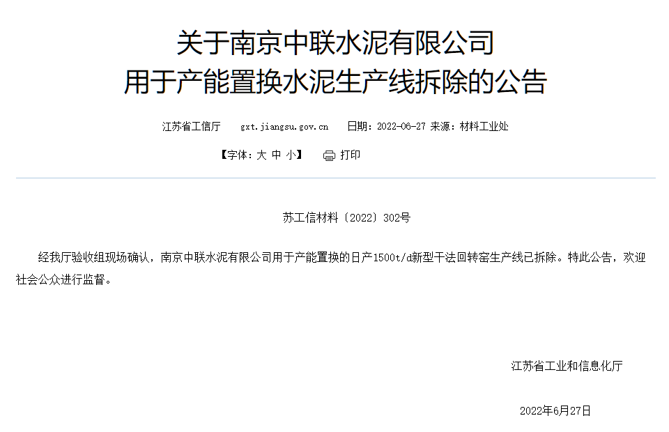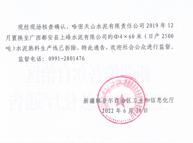 6月30日,新疆维吾尔自治区工业和信息化厅发布3则水泥生产线拆除的通告提到,哈密天山水泥2500t/d、吐鲁番天山2000t/d、阿克苏天山多浪水泥2000t/d熟料生产线已拆除。三条生产线产指指标均置换至广西都安县上峰水泥有限公司的水泥熟料生产线项目。 同期,江苏省工业和信息化厅发布公告显示,南京中联水泥有限公司用于产能置换的1500t/d新型干法回转窑生产线已拆除。