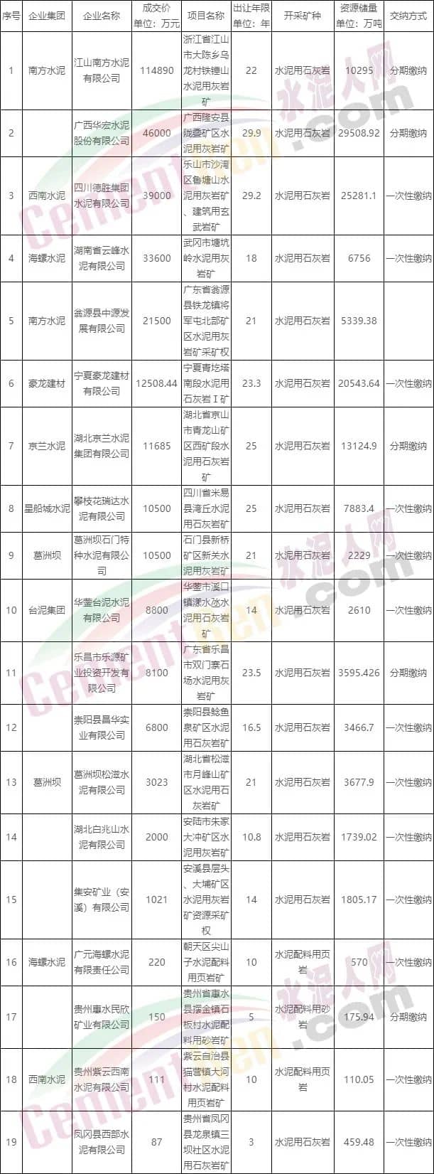 据水泥人网不完统计,近半年来国家自然资源部发布19条已经成交的水泥石灰岩采矿权中最高成交价为江山南方水泥有限公司以114890万元拍下的浙江省江山市大陈乡乌龙村铁锤山水泥用灰岩矿22年,10295万吨采矿权,费用交纳方式为分期。