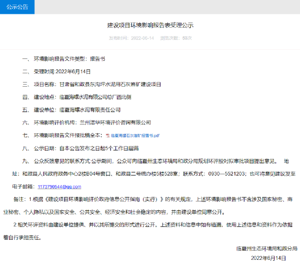 据水泥人网了解,2022年6月14日甘肃省临夏州生态环境局和政分局发布《建设项目环境影响报告表受理公示》。公示建设项目为临夏海螺水泥有限公司总厂西北侧甘肃省和政县东沟坪水泥用石灰岩矿建设项目。
