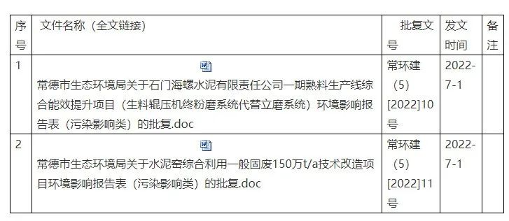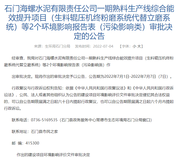 7月4日,湖南省常德市石门县政府转发环局石门分局的《石门海螺水泥有限责任公司一期熟料生产线综合能效提升项目(生料辊压机终粉磨系统代替立磨系统)等2个环境影响报告表(污染影响类)审批决定的公告》称,经审查,生环局石门分局对石门海螺水泥有限责任公司一期熟料生产线综合能效提升项目(生料辊压机终粉磨系统代替立磨系统)等2个环境影响报告表(污染影响类)作出审批决定。并将作出的审批决定予以公告。公告期为2022年7月1日-2022年7月7日。