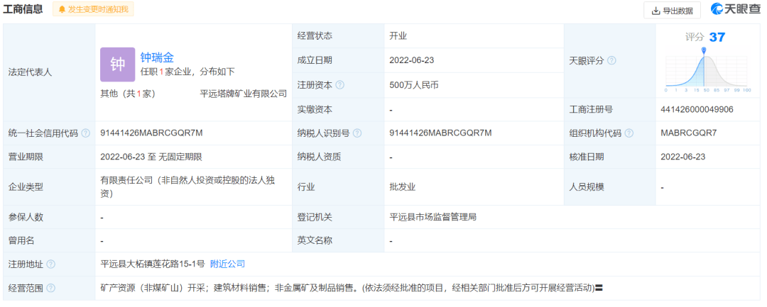 天眼查APP显示,平远塔牌矿业有限公司,于2022年6月23日成立,注册资本为500万人民币,法定代表人为钟瑞金,经营状态为开业,工商注册号为441426000049906,注册地址为平远县大柘镇莲花路15-1号,经营范围包括矿产资源(非煤矿山)开采;建筑材料销售;非金属矿及制品销售。