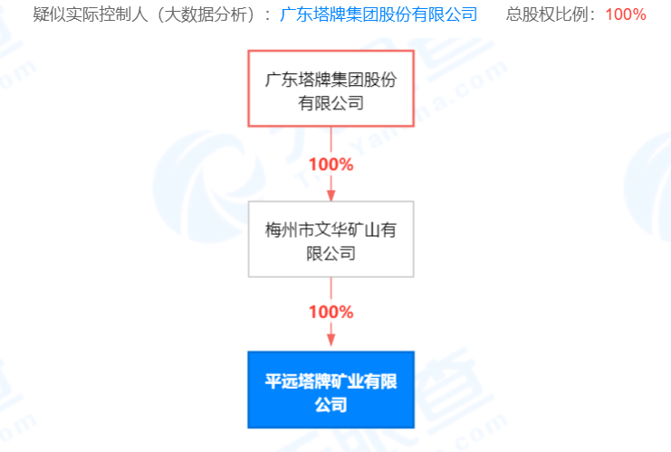 企业疑似实际控制人为广东塔牌集团股份有限公司,总股权比例达100%。