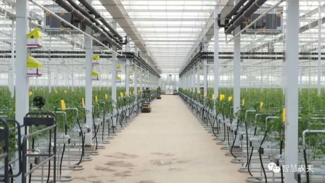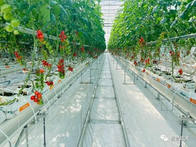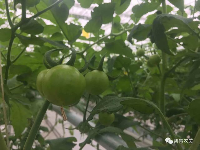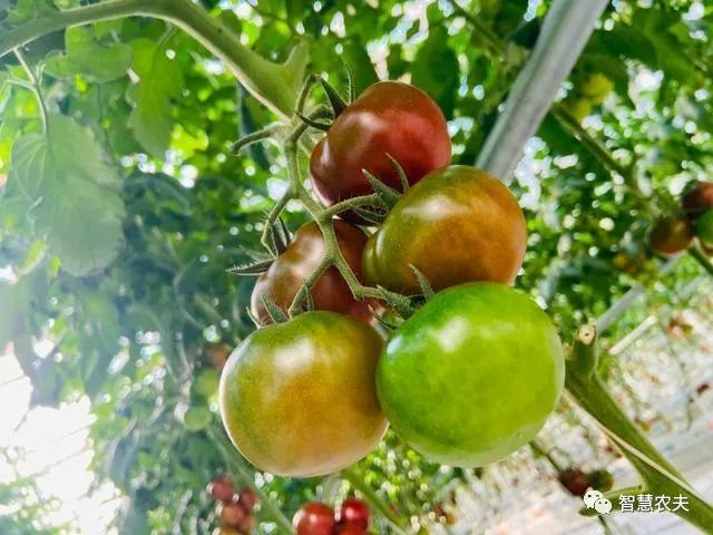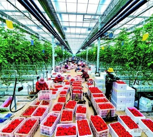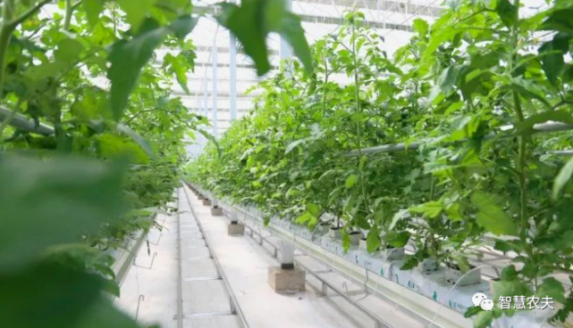 在温室内碧绿的番茄长得郁郁葱葱,长长的悬挂式钢丝蔓绳,有利于作物攀爬生长,增加产量。成排的管道通往室内各个方向,笔直的采摘轨道,既用来运载采摘车,也用来传递余热转化成的热水或者冷水。番茄生长每一个环节都依托大数据云计算自动采集、监测、分析农作物生长环境信息,并利用物联网技术,精准调控棚内的温度、湿度、施肥量、浇水量等,科学调节农作物生命规律,延长生长周期,实现智慧化管理、标准化生产。