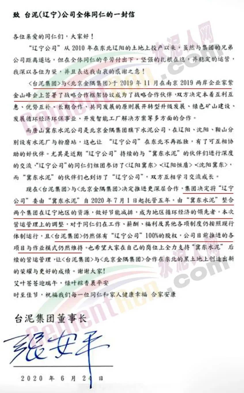 据水泥人网此前报道,2020年6月台泥集团董事长张安平先生在发给台泥(辽宁)公司全体员工的一封公开信中称:台泥集团与北京金隅集团于2019年11月在“南京2019两岸企业家紫金山峰会”上签署了战略合作框架协议,成为了战略合作伙伴。