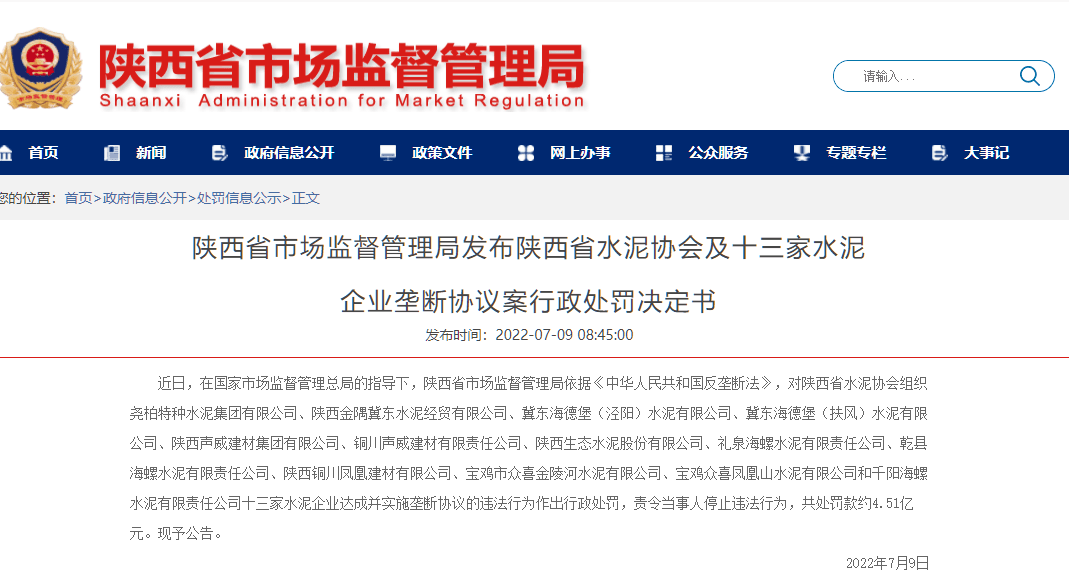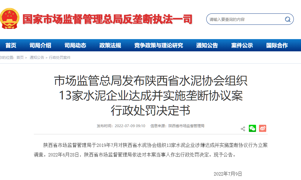 日前,市场监管总局发布陕西省水泥协会组织13家水泥企业达成并实施垄断协议案行政处罚决定书称,陕西省市场监督管理局于2019年7月对陕西省水泥协会组织13家水泥企业涉嫌达成并实施垄断协议行为立案调查。2022年6月28日,陕西省市场监督管理局依法对本案当事人作出行政处罚决定。现予公告。