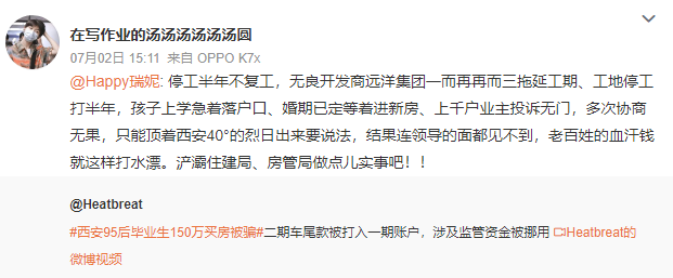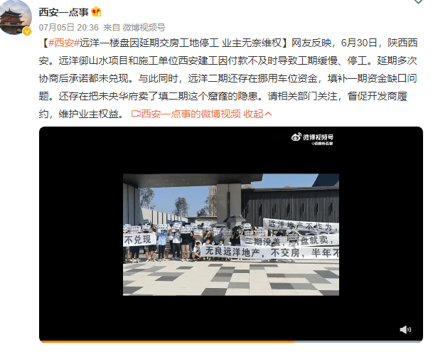 6月30日,陕西西安。远洋御山水项目和施工单位西安建工因付款不及时导致工期缓慢、停工。延期多次协商后承诺都未兑现。与此同时,远洋二期还存在挪用车位资金,填补一期资金缺口问题。还存在把未央华府卖了填二期这个窟窿的隐患。