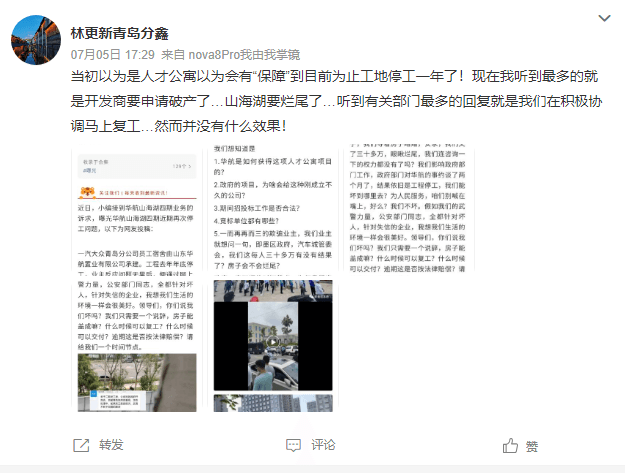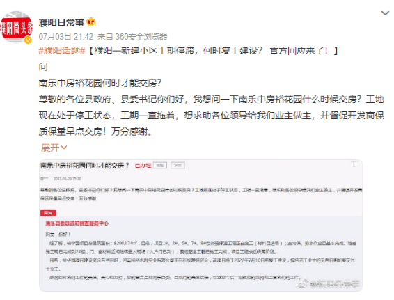 濮阳一新建小区工期停滞,何时复工建设?官方回应项目方建设资金有困难,企业正在积极筹措资金,项目将于7月10前复工建设。