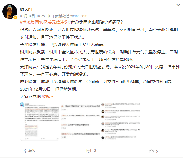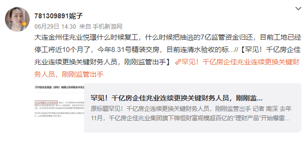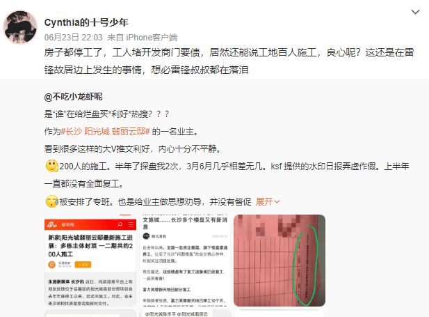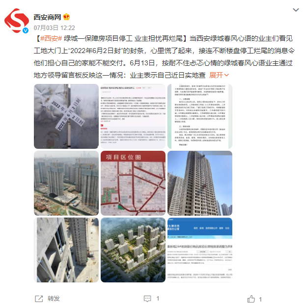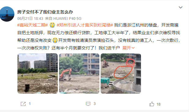 近期众多网友在社交媒体上晒出项目停工的消息。据不完全统计,6月下旬至今社交媒体上晒出的项目停工的消息涉及远洋山水、正荣地产、世茂集团、融信中国、绿城地产、恒大、佳兆业、融创中国、阳光城等多个地产龙头企业。
