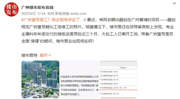 融创在广州黄埔的项目——融创翔龙广府壹号疑似工地停工。在领导留言板上发现,有业主爆料称年底交付的楼栋进度滞后近三个月,大批工人已离开工地。
