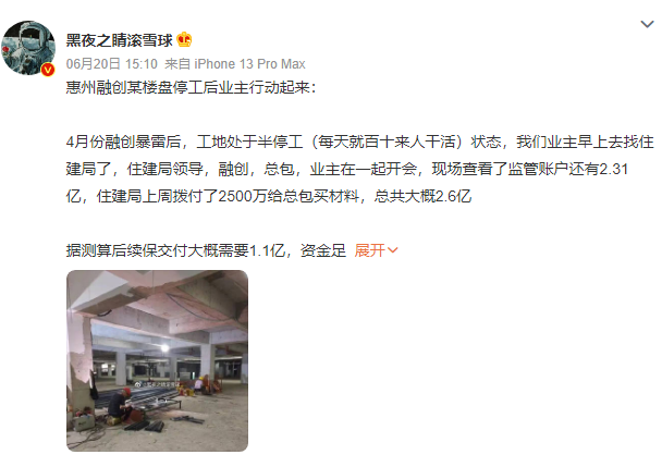 4月份融创暴雷后,惠州融创某楼盘工地处于半停工业主早上去找住建局了,住建局领导,融创,总包,业主在一起开会,现场查看了监管账户还有2.31亿,住建局上周拨付了2500万给总包买材料,总共大概2.6亿。