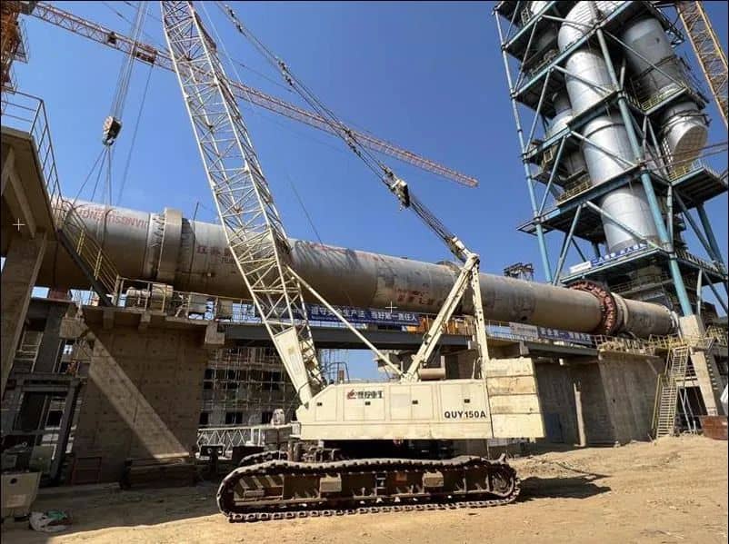 项目部为了确保回转窑吊装作业安全顺利进行,克服了人员、机械设备进场困难,认真编制、反复核验施工方案,对参与吊装的人员进行专项培训,对吊装步骤、安全注意事项进行了详细交底。吊装作业由专业起重师担任吊装总指挥,施工班组在作业过程中有条不紊、高效推进。最终项目部安全、优质地完成了回转窑筒体吊装合龙任务。