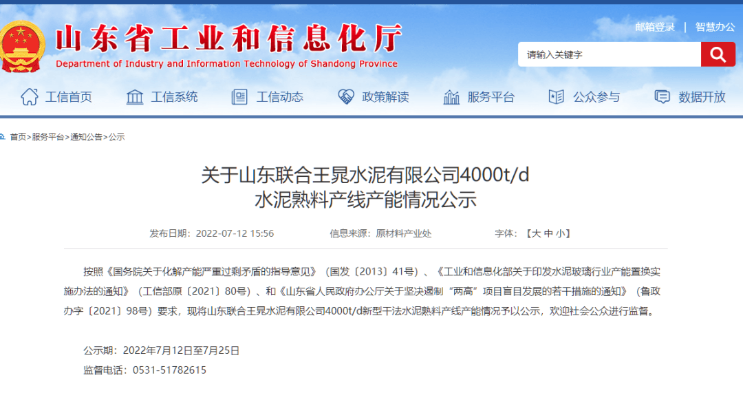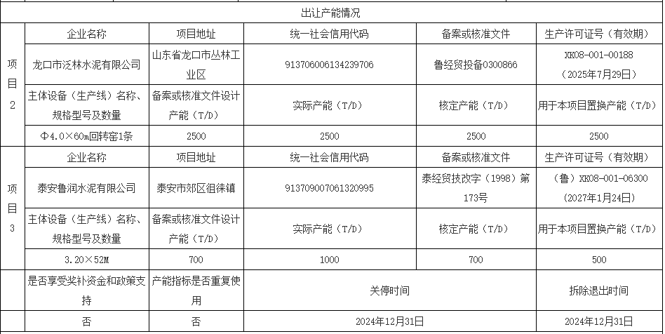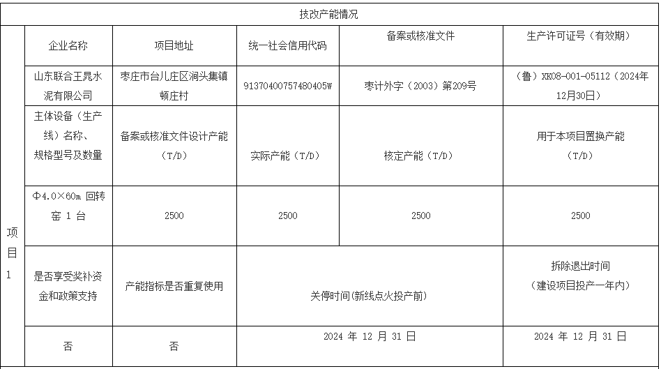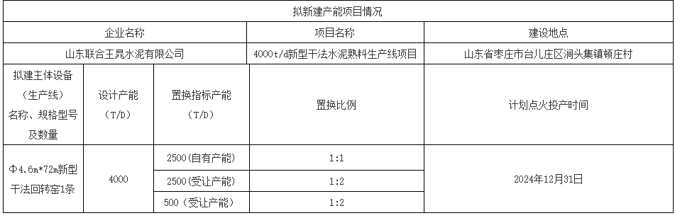 7月12日,山东省工信厅发布《关于山东联合王晁水泥有限公司4000t/d水泥熟料产线产能情况公示》。公示内容为山东联合王晁水泥有限公司拟通过退出自有2500t/d, 龙口市泛林水泥有限公司2500t/d、泰安鲁润水泥有限公司700t/d三条熟料生产线,在山东省枣庄市台儿庄区涧头集镇顿庄村新建一条4000t/d熟料生产线,计划点火时间为2024年12月31日。 山东联合王晁水泥有限公司 4000t/d新型干法水泥熟料产线产能情况表