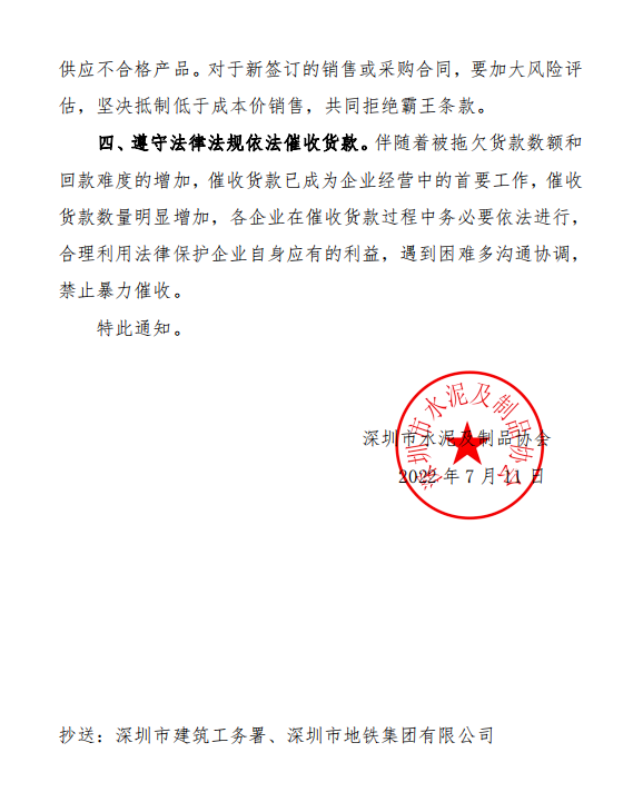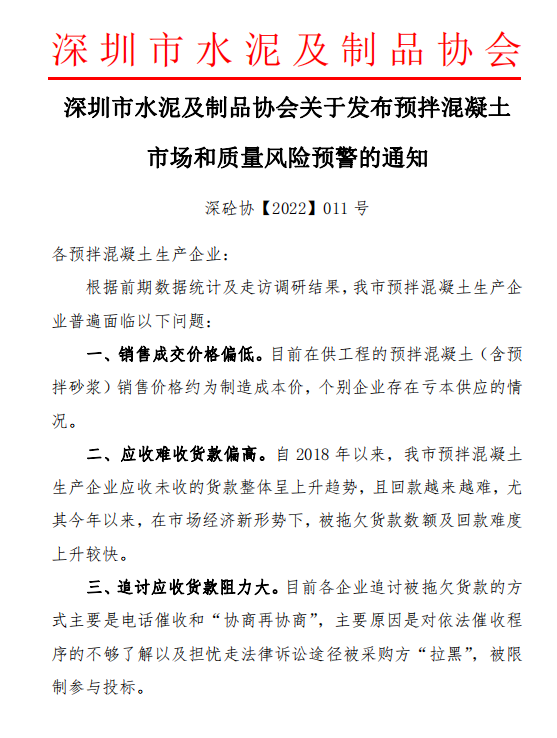 日前,深圳市水泥及制品协会关于发布预拌混凝土市场和质量风险预警的通知给各预拌混凝土生产企业称,根据前期数据统计及走访调研结果,深圳市预拌混凝土生产企业普遍面临销售成交价格偏低、应收难收货款偏高、追讨应收货款阻力大、新中标价格持续偏低等问题。