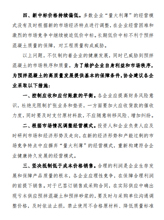 以上问题,不仅制约着企业的健康发展,同时已威胁到预拌混凝土的市场秩序和质量。为了维护企业自身利益和市场秩序,为预拌混凝土的高质量发展提供基本的保障条件,协会建议各企业,控制应收和应付账款的平衡、根据市场情况调整经营模式、坚决抵制低于成本价格销售、遵守法律法规依法催收货款。