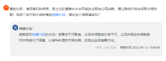据了解,近期海螺水泥在回复投资者提问时曾多次提到“确保市场份额,追求企业效益最大化”。