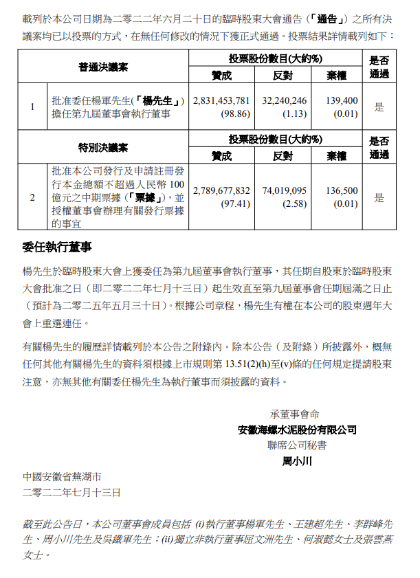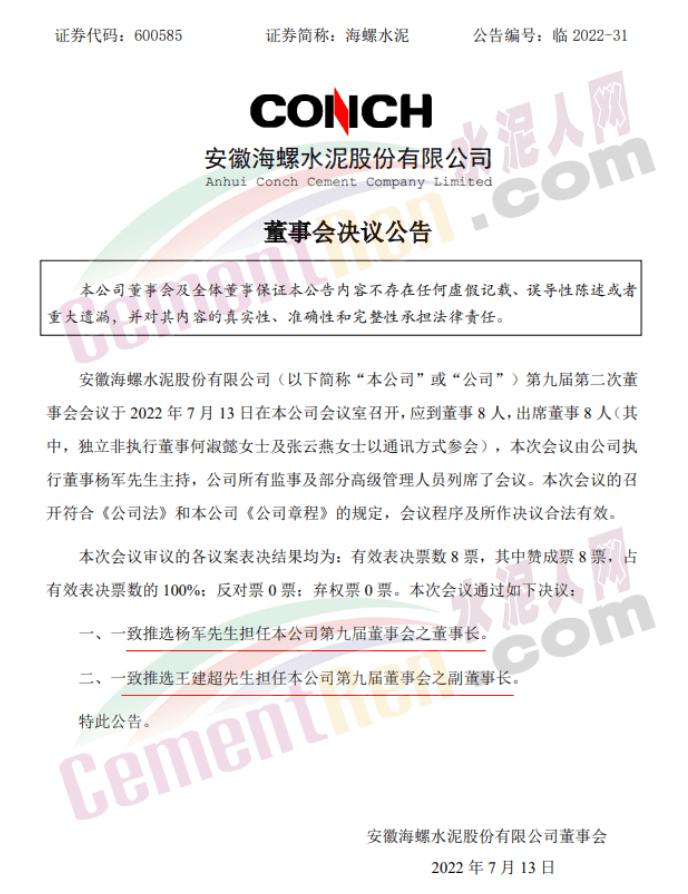 海螺水泥(600585)7月13日晚间公告,公司第九届第二次董事会会议于当日召开,会议一致推选杨军担任公司第九届董事会之董事长;一致推选王建超担任公司第九届董事会之副董事长。
