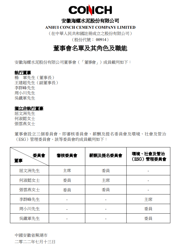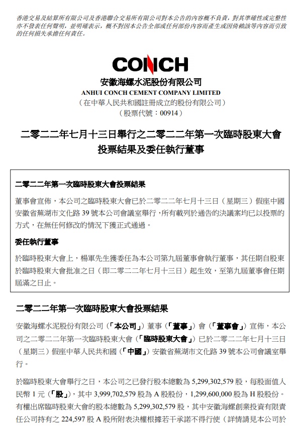 杨先生于二零二二年五月加入安徽海螺集团有限责任公司(「海螺集团」),现担任海螺集团党委书记、董事长。