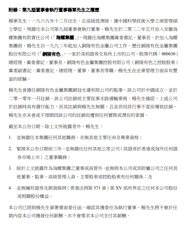 水泥人网注意到,海螺水泥另一则公告附录中提到截至公告日,杨军先生: