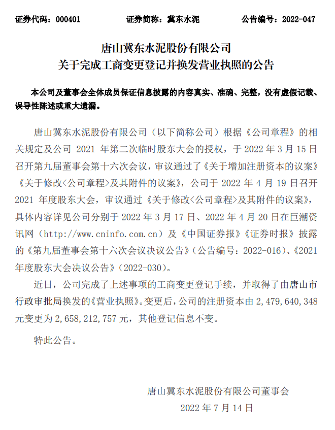 唐山冀东水泥股份有限公司根据《公司章程》的相关规定及公司2021年第二次临时股东大会的授权,于2022年3月15日召开第九届董事会第十六次会议,审议通过了《关于增加注册资本的议案》《关于修改<公司章程>及其附件的议案》,公司于2022年4月19日召开2021年度股东大会,审议通过《关于修改<公司章程>及其附件的议案》,具体内容详见公司分别于2022年3月17日、2022年4月20日在巨潮资讯网及《中国证券报》《证券时报》披露的《第九届董事会第十六次会议决议公告》(公告编号:2022-016)、《2021年度股东大会决议公告》(2022-030)。