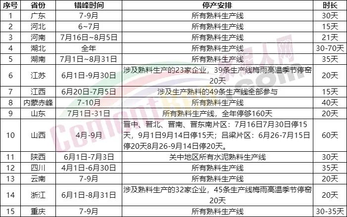 相关行业人士对水泥人网表示,不只河南区域,因熟料库位相对较高,除部分企业选择自主停窑外,山东、河北、湖南、江西等十余个省市地区已经陆续发布了水泥行业夏季错峰生产计划。其中,山东熟料生产线7月计划停窑20天、河北省熟料生产线7月停窑15天……