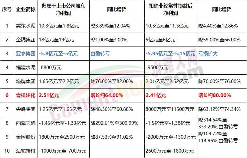 日前,冀东水泥、金隅集团、亚泰集团、福建水泥、塔牌水泥、青松建化、尖峰集团、西藏天路、金圆股份以及海螺新材等10家企业发布上半年业绩预告。除青松建化业绩预增外,亚泰集团业绩预亏,其他8家企业预告业绩下滑。