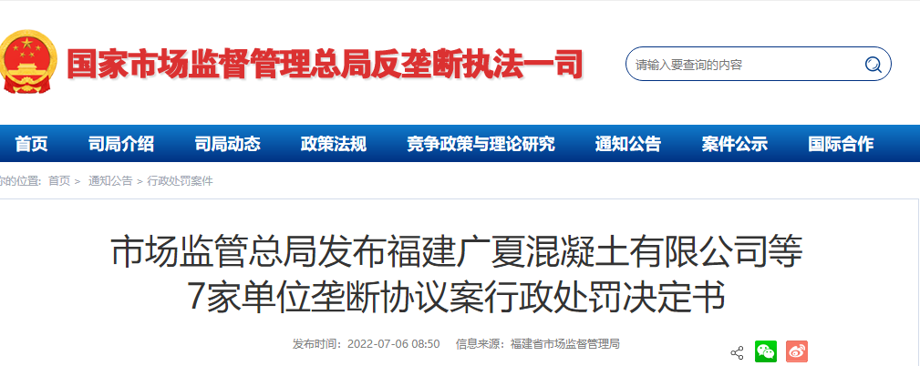 2022年6月8日,福建省市场监督管理局依法对福建广夏混凝土有限公司、杭德(建阳)混凝土有限公司、南平市建阳区华盛混凝土有限公司、福建省武夷建达混凝土有限公司、福建武夷沥青混凝土有限公司、南平市建阳区永固混凝土有限公司、福建省云信混凝土有限公司等7家混凝土企业作出行政处罚决定共处罚款1582.9万元。