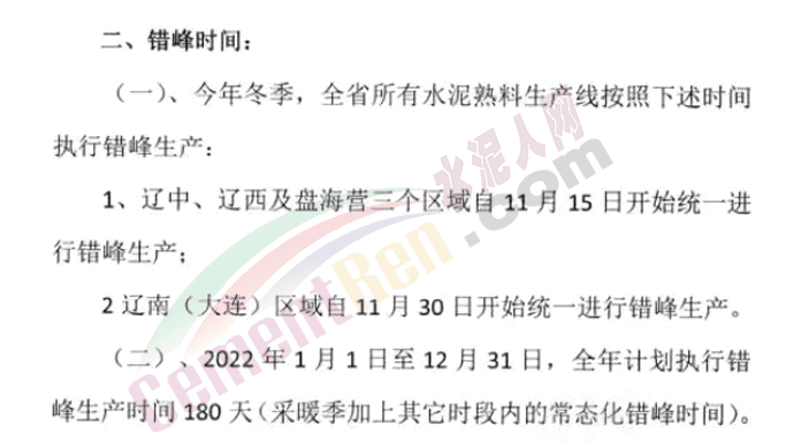 据水泥人网此前报道,早在去年12月辽宁省建筑材料工业协会水泥分会就发布了《辽宁省水泥行业2021年冬季和2022年错峰生产方案》要求:2022年1月1日至12月31日,全年计划执行错峰生产时间180天。
