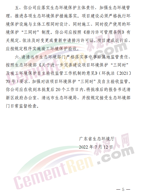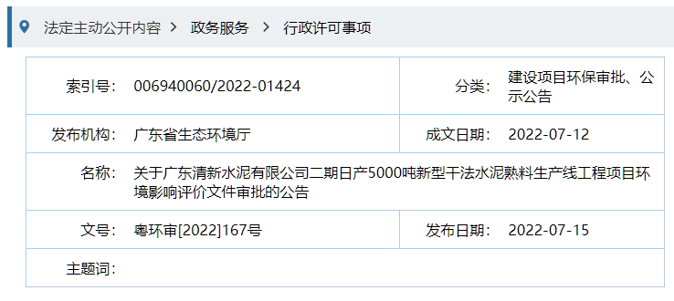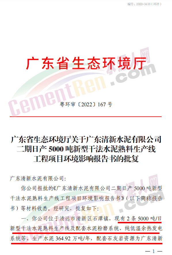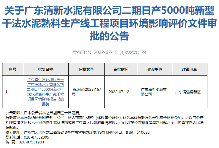 日前,广东生态环境厅发布《关于广东清新水泥有限公司二期日产5000吨新型干法水泥熟料生产线工程项目环境影响评价文件审批的公告》提到广东清新水泥有限公司报批的《广东清新水泥有限公司二期日产 5000 吨新型干法水泥熟料生产线工程项目环境影响报告书》(以下简称报告书)等材料收悉。