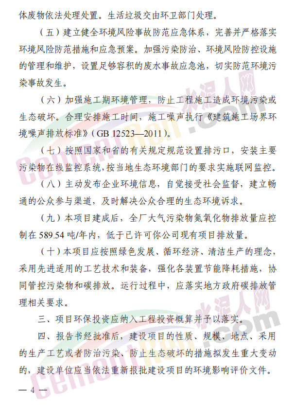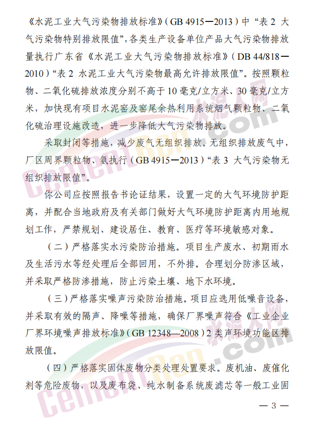 (一)严格落实大气污染防治措施。项目各工序产生的废气应有效收集处理,各排气筒高度不低于报告书建议值。本项目水泥窑及窑尾余热利用系统烟气颗粒物、二氧化硫、氮氧化物排放浓度应分别不高于 10 毫克/立方米、30 毫克/立方米、50 毫克/立方米。