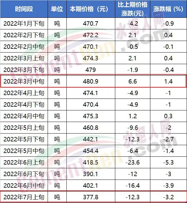 国家统计局流通领域价格信息显示,P.O 42.5散装水泥2022年3月中旬报480.9元/吨为上半年最高价,2022年7月上旬报377.8元/吨,为相对较低价,高价与低价相差100元/吨以上。