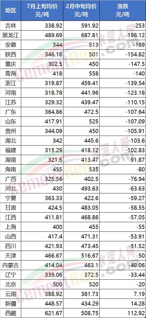 从上述数据可见,自2022年春节以来,31个省市自治区中,除云南、新疆、西藏3个区域外,其余29个区域均处于下跌状态。据水泥人网信息中心重点监控的600多家水泥企业P.O42.5散装水泥报价,7月初,重庆、安徽、河南、吉林、浙江、广西、贵州、辽宁、福建、湖南等10多个省市地区绝大多数企业报价已跌至300元/吨以下。