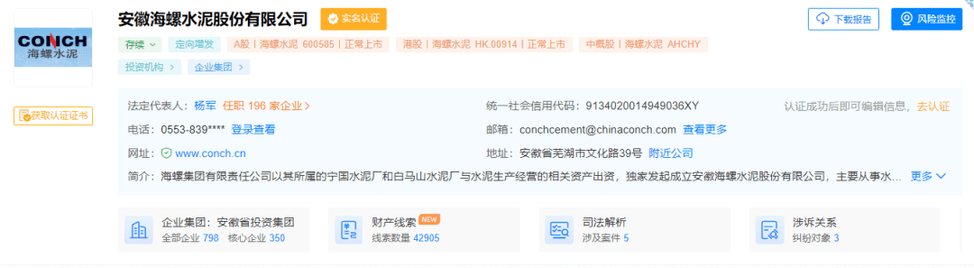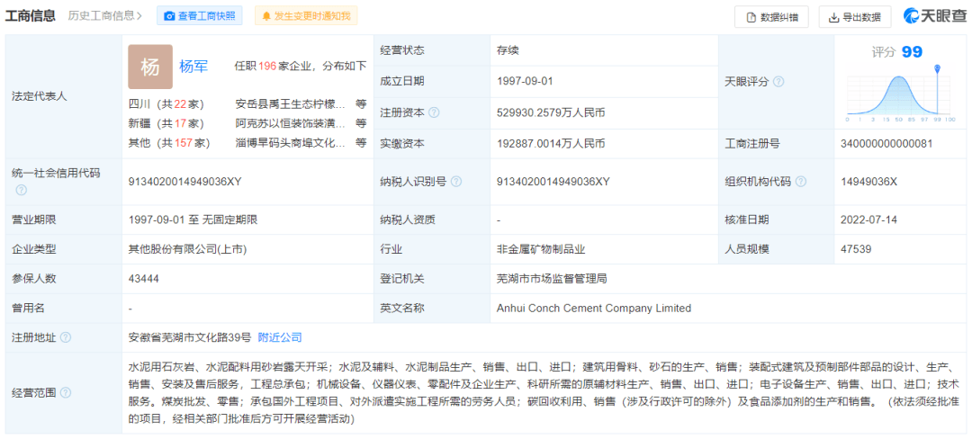 天眼查数据显示:7月14日,安徽海螺水泥股份有限公司(以下简称“海螺水泥”)法定代表人由王诚变更为杨军。