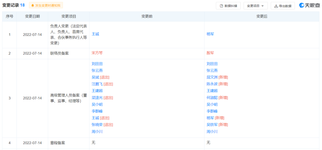 据查询,7月14日发生的变更项目分别为负责人变更 ,联络员变更、高级管理人员备案变更等。